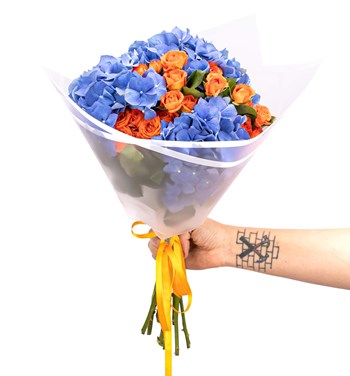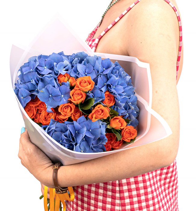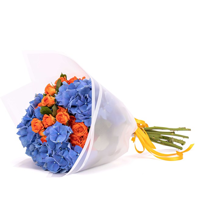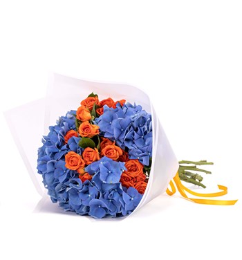 Çivit Mavi Ortanca ve Turuncu Çardak Güller Buketi