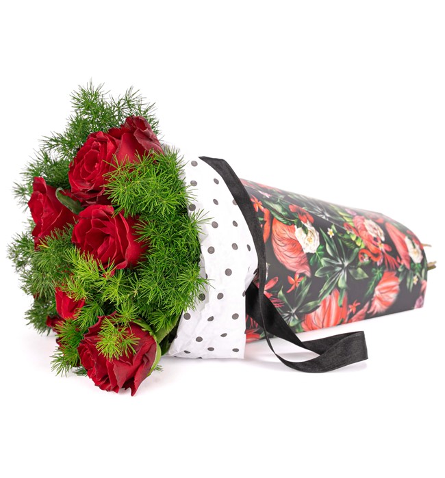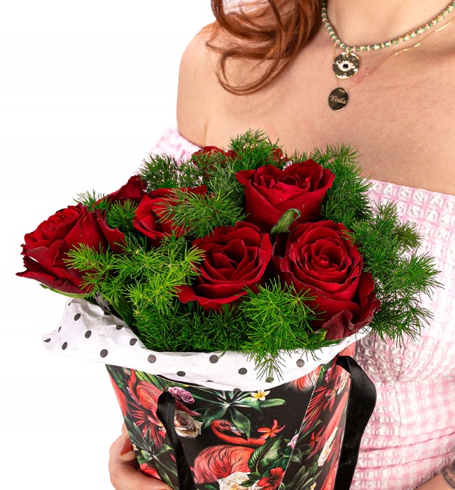 Özel taşıma çantasında 7 adet kırmızı gül ve asparagus ile hazırlanmıştır.