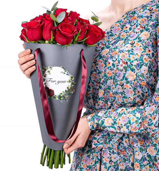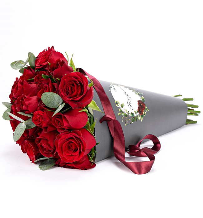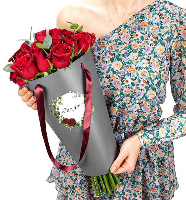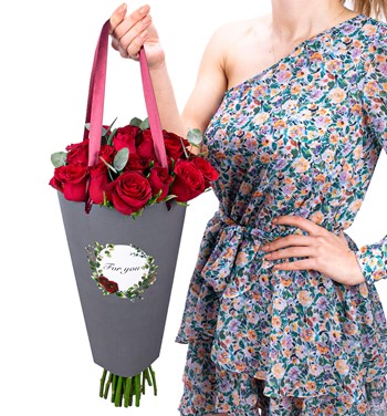 Özel taşıma çantasında 20 adet kırmızı gül ve okaliptus yaprakları kullanılmıştır.