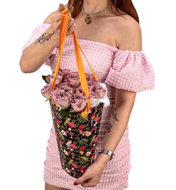 Özel taşıma çantasında lila güller ile hazırlanmıştır.