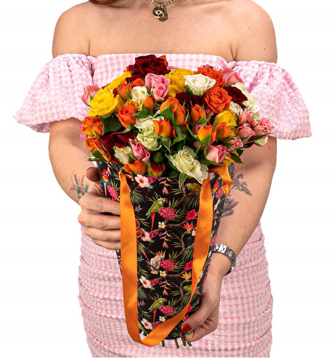 Özel taşıma çantasında mini mix güller ile hazırlanmıştır.