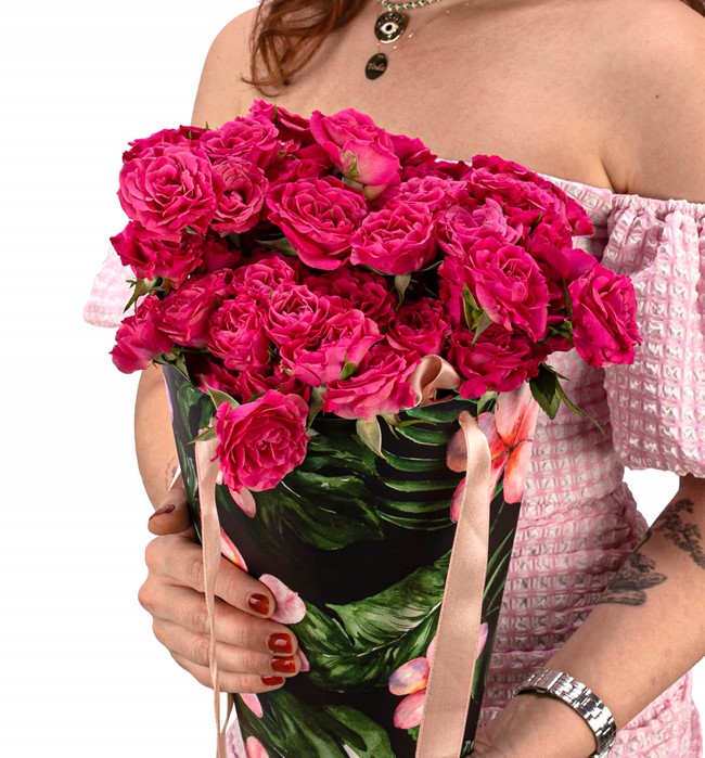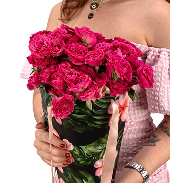 Özel taşıma çantasında mini fuşya güller ile hazırlanmıştır.