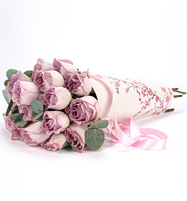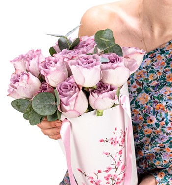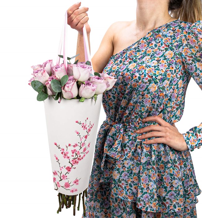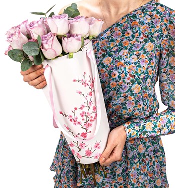 Lila büyük güller sakura baskılı taşıma çantasında kullanılmıştır. 15 adet lila gül bulunmaktadır.