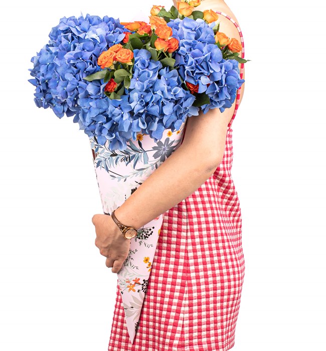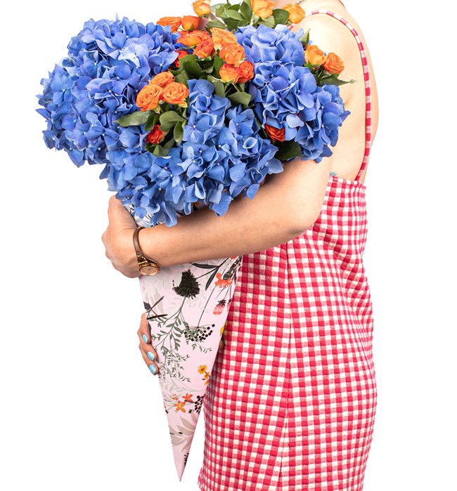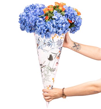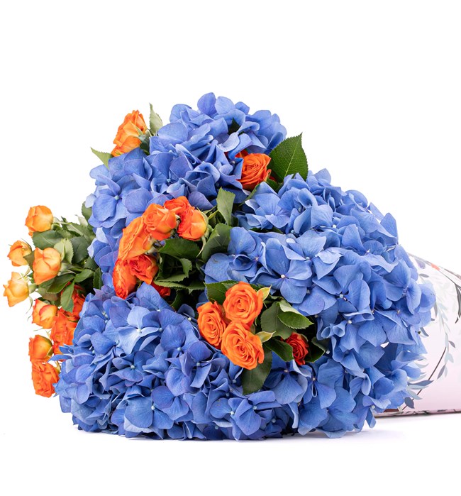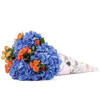 Venti Kornet Serisi - İthal Mavi Ortanca ve Turuncu Çardak Gül Buketi büyük aşkınızı O'na hiç bir şey söylemeden de anlatabilmeniz için özel olarak tasarlandı. Tasarım 48 x 48 cm ölçülerinde kornet içerisinde turuncu güller ve mavi ortancalar ile hazırlandı.
